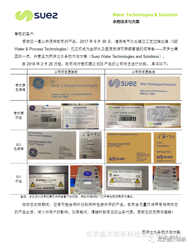 因2017年9月30日,苏伊士集团(SUEZ)正式完成对前通用电气水处理及工艺过程处理(GE水处理)的收购交割,通过整合GE水处理业务和苏伊士工业水务业务,正式更名为苏伊士水务技术与方案,简称“SUEZ-WTS"。现GE标的卷式膜及EDI产品包装及标签LOGO已切换为SUEZ标。